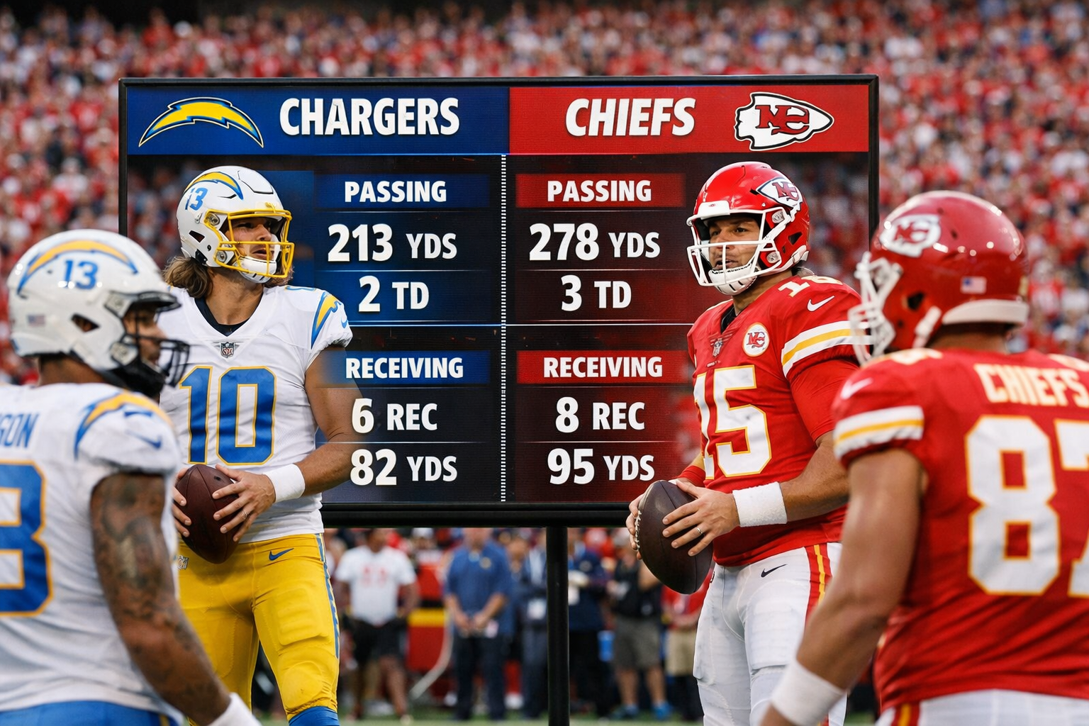 Quarterback play is always the centerpiece when analyzing the Los Angeles Chargers vs Kansas City Chiefs match player stats. With elite talents leading both teams, the passing game often determines the outcome. The Chiefs’ quarterback is known for extending plays, throwing accurately on the run, and making explosive downfield passes. On the other side, the Chargers’ signal-caller brings a powerful arm, precise timing, and the ability to attack tight windows.
